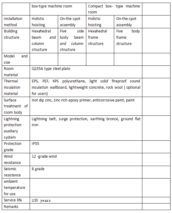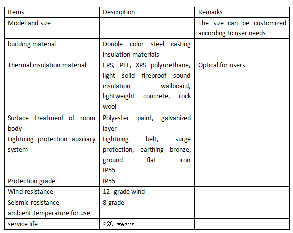 It has the characteristics of convenient installation, beautiful appearance, strong structure, energy saving and environmental protection, heat insulation and temperature insulation, perfect matching and intelligent control management. The materials of walls and roof are double color plate textnote polystyrene or high density polyurethane. At the same time, the materials of walls and roof can also be light concrete and light solid firewall board. The effective service life of the machine room is more than 20 years.