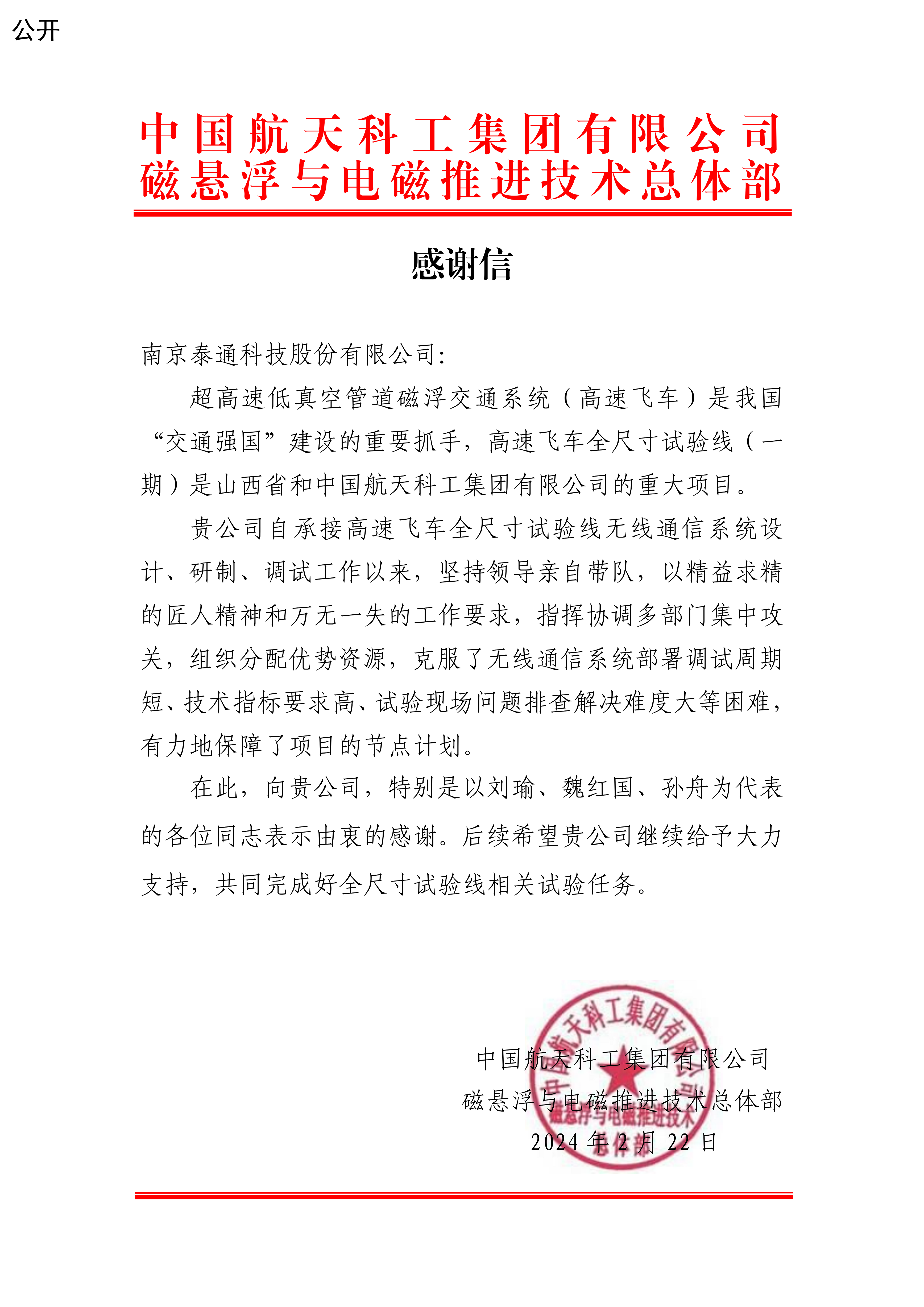 近期,泰通科技收到來自中國航天科工集團(tuán)發(fā)來的感謝信,信中表達(dá)了“泰通科技自承接高速飛車全尺寸試驗(yàn)線無線通信系統(tǒng)設(shè)計(jì)、研制、調(diào)試工作以來,堅(jiān)持領(lǐng)導(dǎo)親自帶隊(duì),以精益求精的匠人精神和萬無一失的工作要求,指揮協(xié)調(diào)多部門集中攻關(guān),組織分配優(yōu)勢資源,克服了無線通信系統(tǒng)部署調(diào)試周期短、技術(shù)指標(biāo)要求高、試驗(yàn)現(xiàn)場問題排查解決難度大等困難,有力地保障了項(xiàng)目的節(jié)點(diǎn)計(jì)劃?!边@封感謝信不僅是對公司技術(shù)實(shí)力的認(rèn)可,更是對此次合作成果的高度肯定。