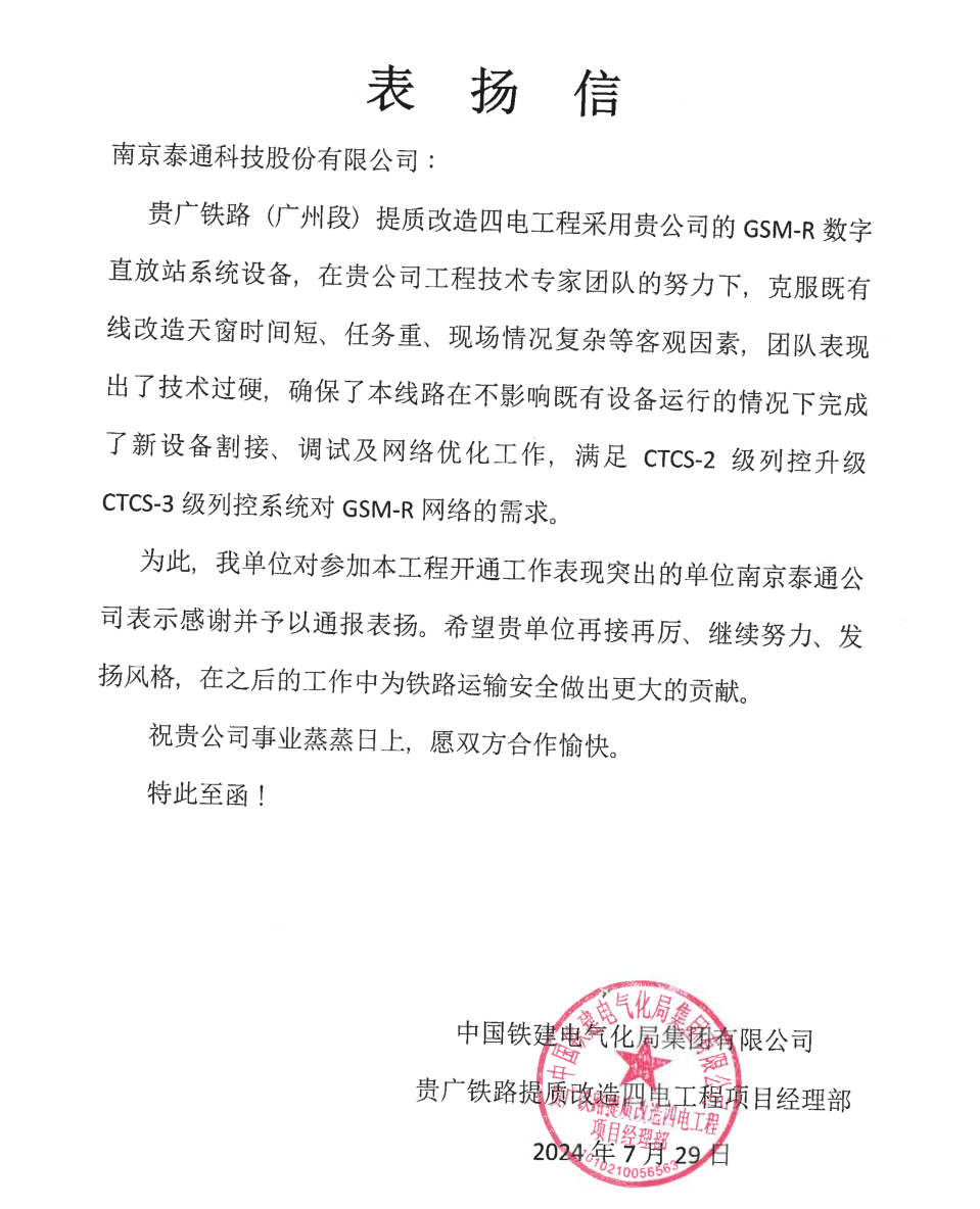 近日,泰通科技收到中國鐵建電氣化局集團有限公司發(fā)來的表揚信。信中對公司在貴廣鐵路(廣州段)提質(zhì)改造四電工程中出色的專業(yè)能力和高效的團隊協(xié)作表達了感謝,同時希望泰通科技再接再厲,在之后的工作中為鐵路運輸安全做出更大貢獻。